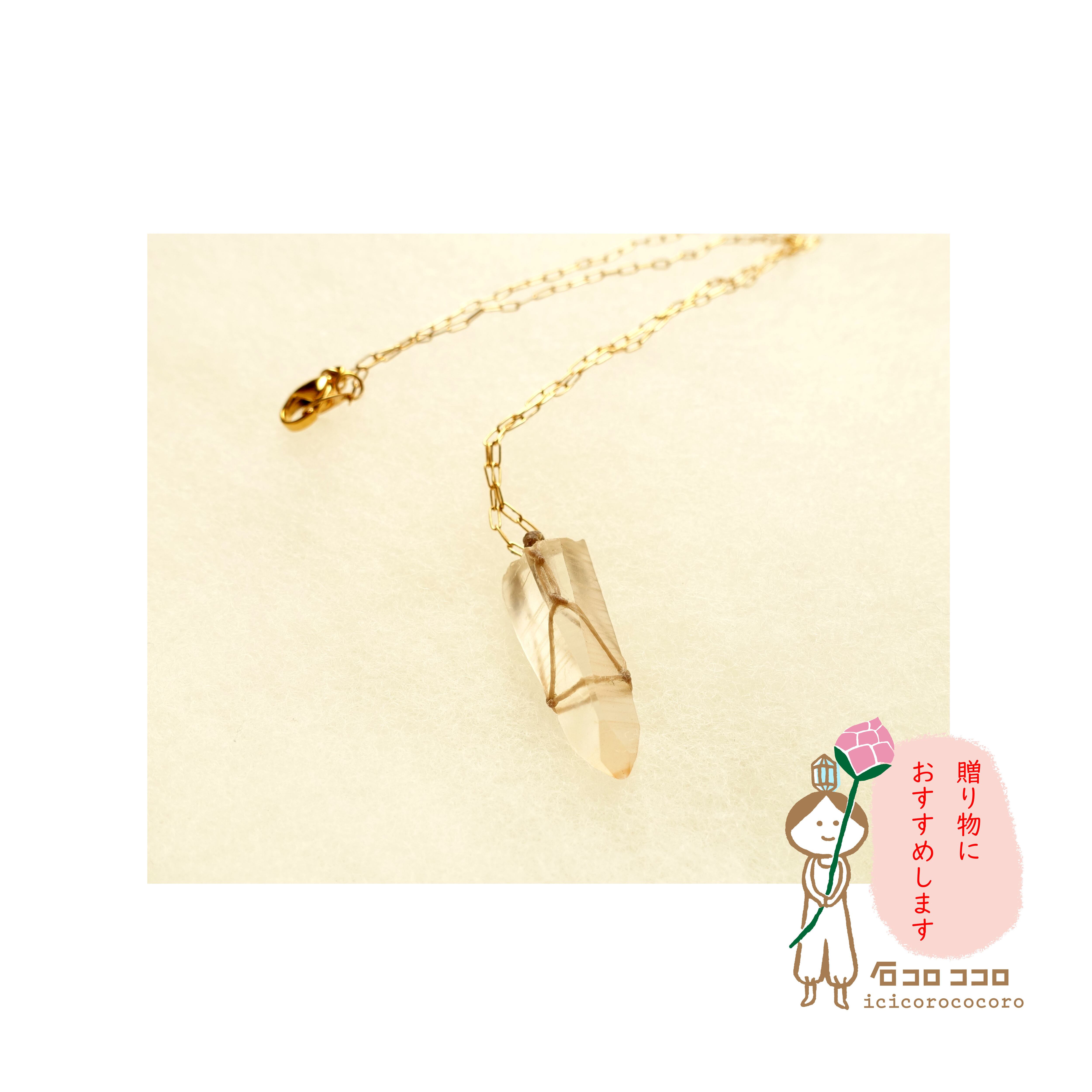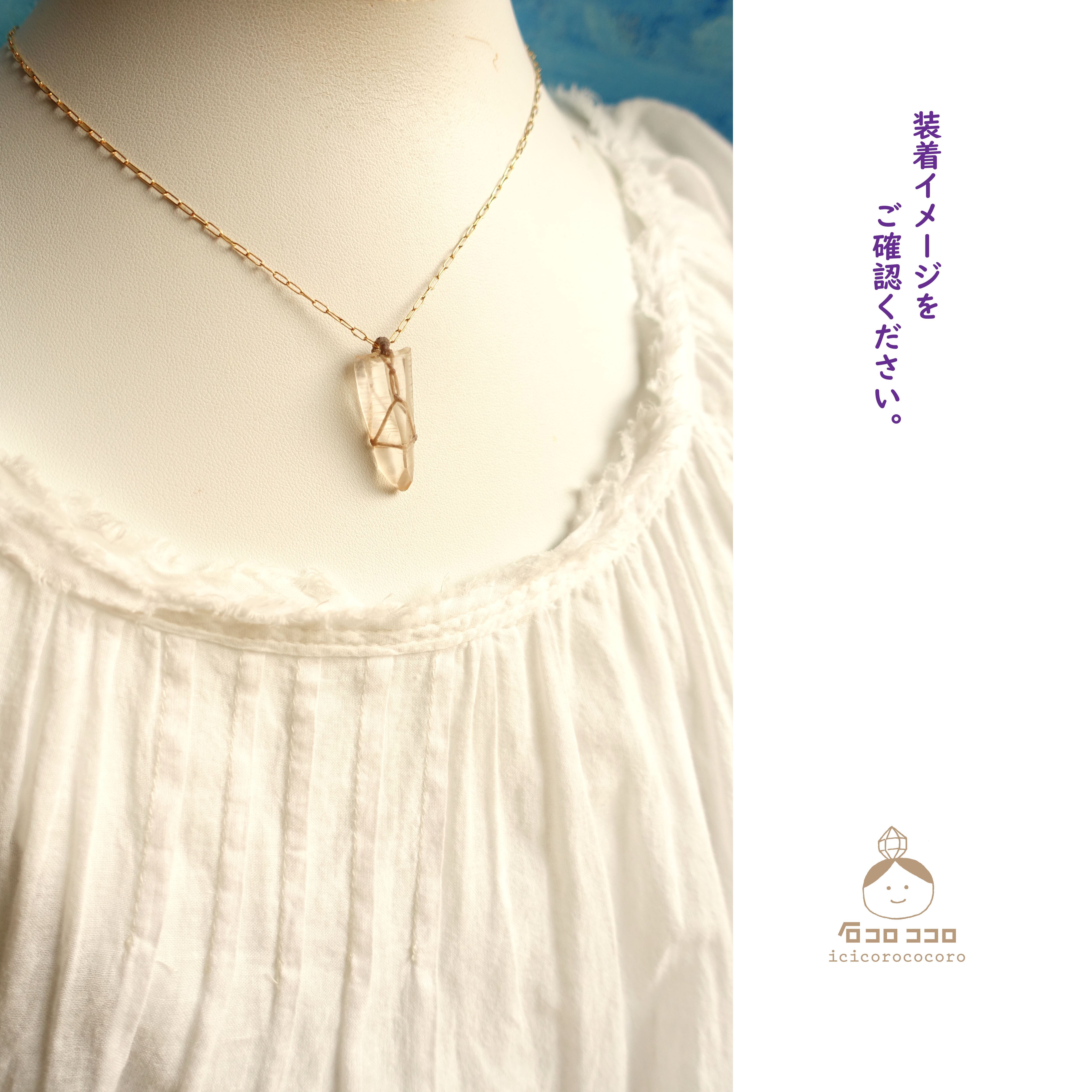 ・水晶のポイント原石のネックレス というとゴツイ印象があるかもしれませんが、こちらは長さ3センチほど。やっと見つけた小ぶりなレムリアン。