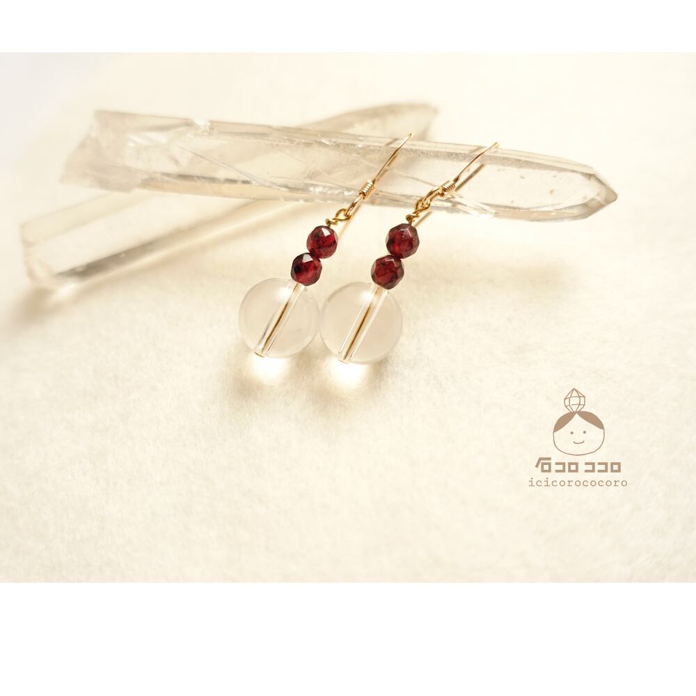 ・水晶の上に「ガーネット」を2粒添えてみたら、かわいらしいピアスになりました。