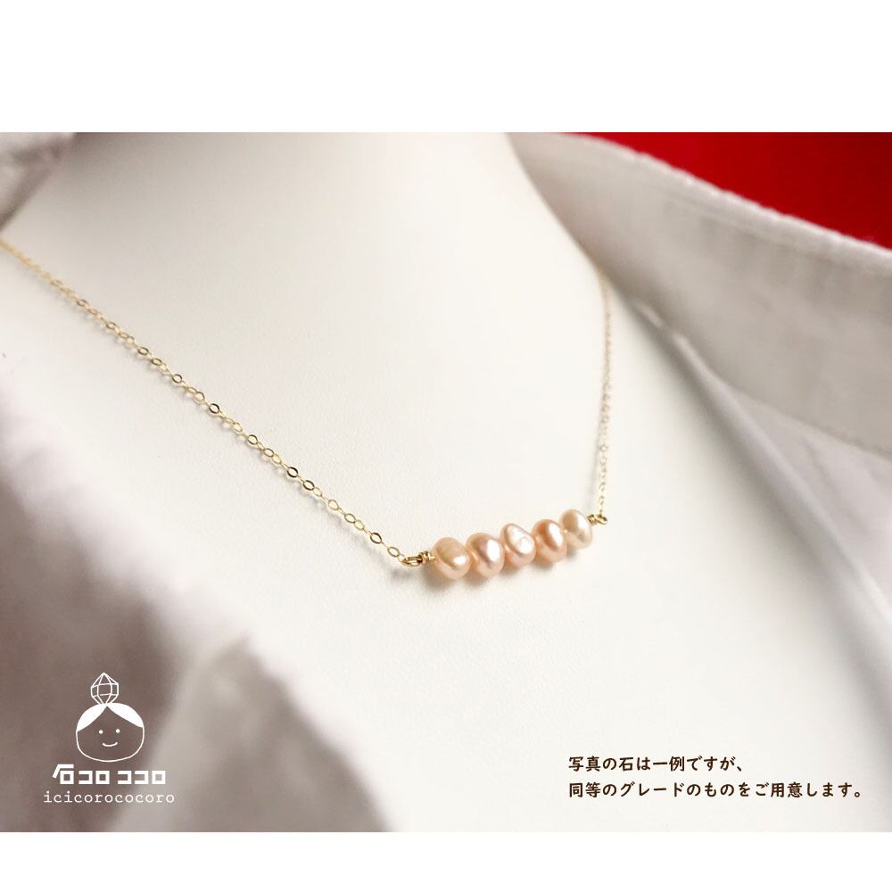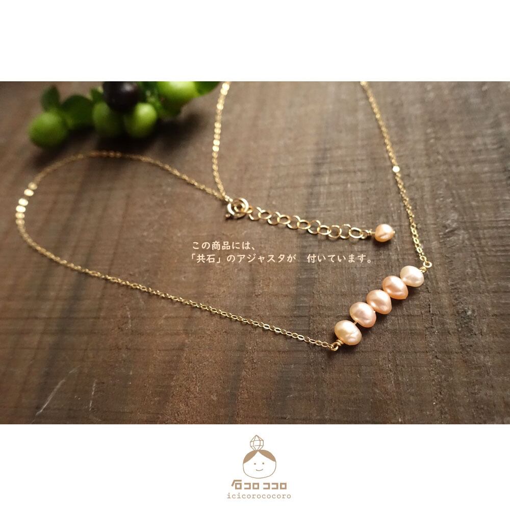 薄ももいろの淡水真珠(淡水パール)を、5粒並べたネックレスです。