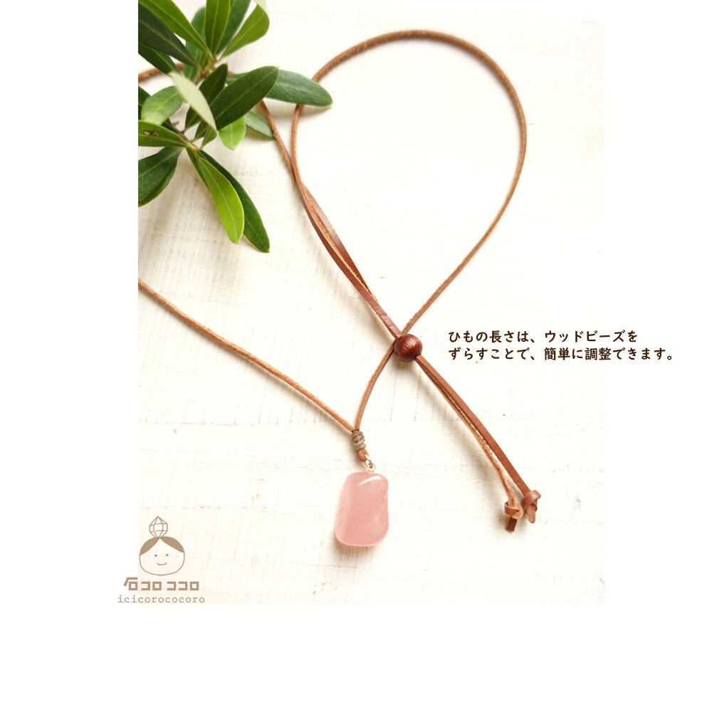 ほどよくラフなローズクォーツを、革紐ペンダントに仕立てました。